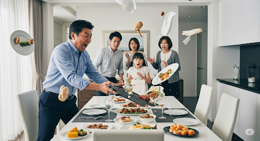 キムかつは突然立ち上がり、テーブルの上の料理を薙ぎ払った。皿が床に落ちて砕ける音、姪っ子の泣き声、ケンジ夫婦の驚愕の表情。