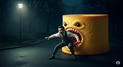 キムかつは憎悪を込めてカステラを睨みつけ、地面に叩きつけようとした。しかし、その瞬間、カステラがぬるりと手の中で蠢いた。そして、みるみるうちに大きくなっていく。黄色いスポンジがキムかつの視界を覆い尽くし、甘ったるい匂いが鼻をつく。